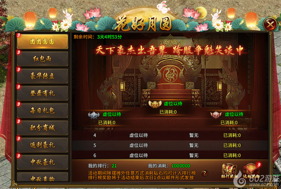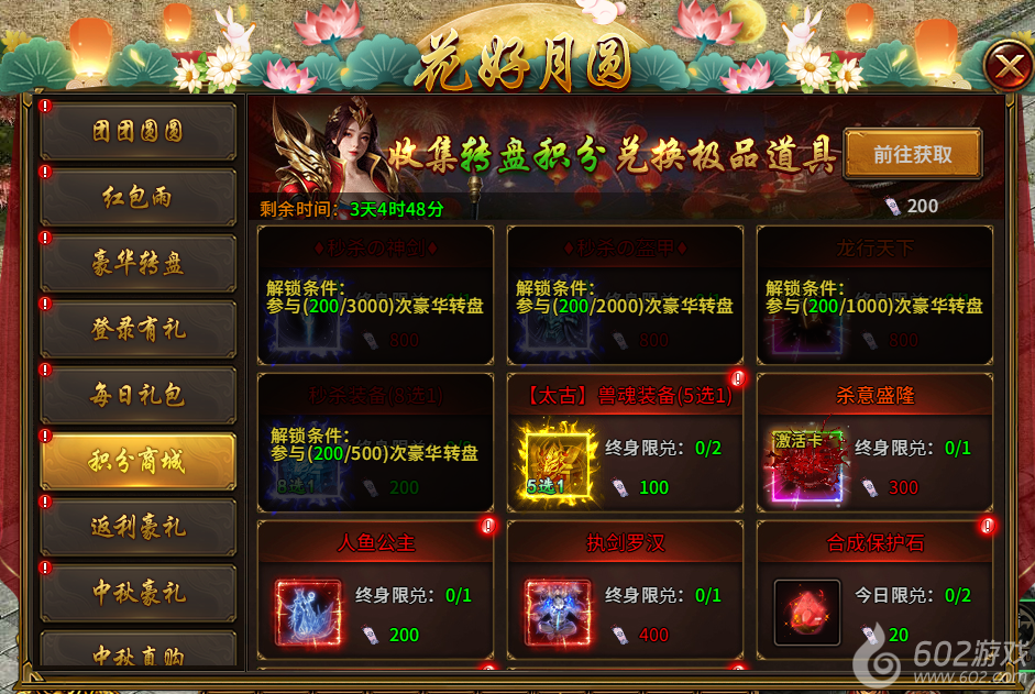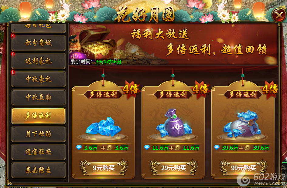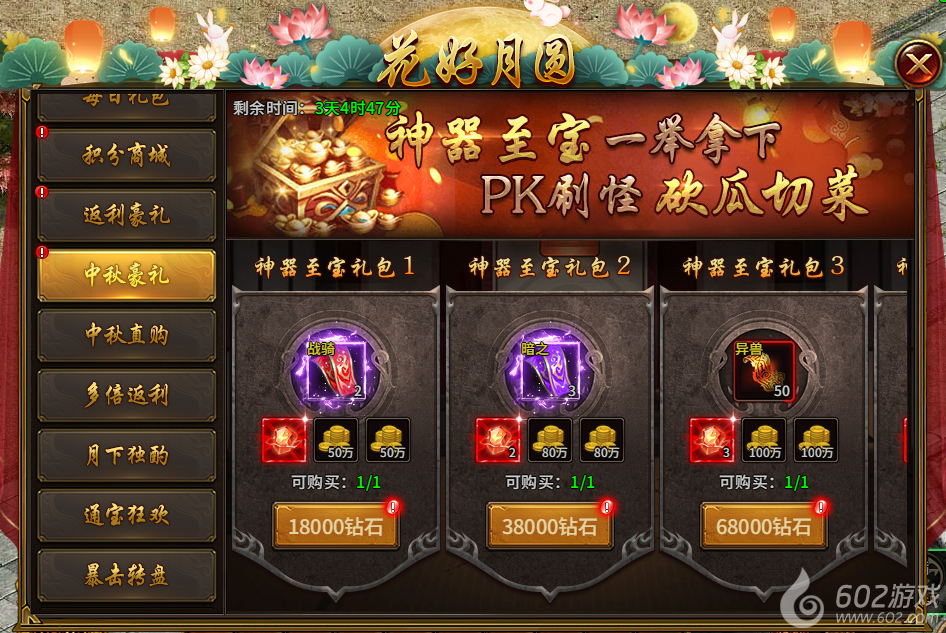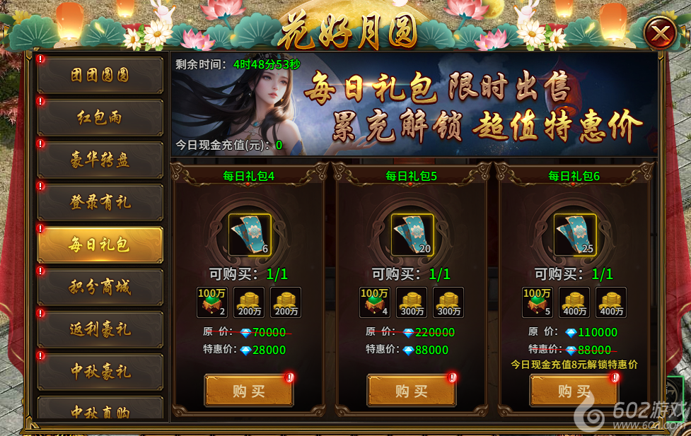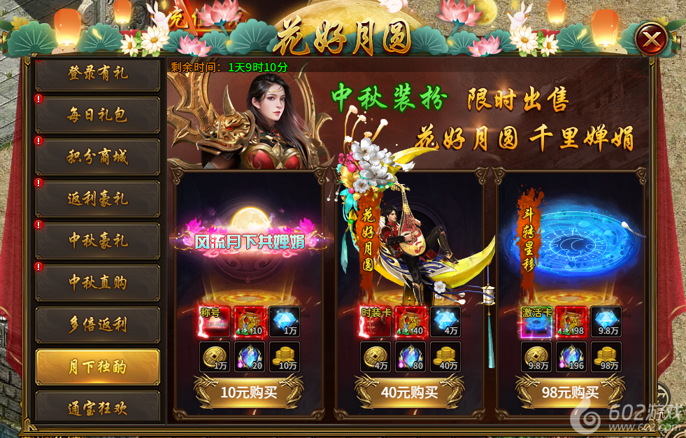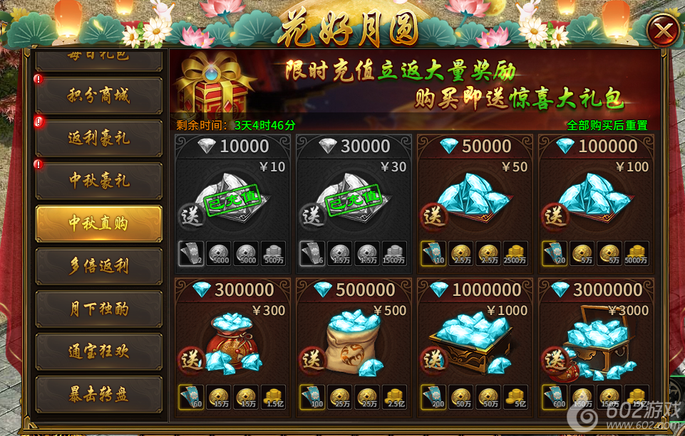 9) 中秋直购(活动1-7天且开服天数达到36天开启,直购,所有档位购买完后可重置):