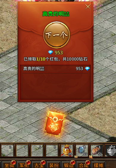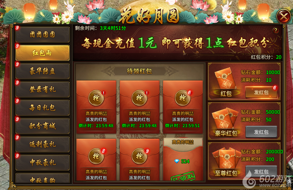 2) 红包雨(活动1-7天可开启,活动期间玩家每现金充值1元可获得1红包积分,消耗红包积分可发放跨服钻石红包,所有玩家均可参与抢红包):