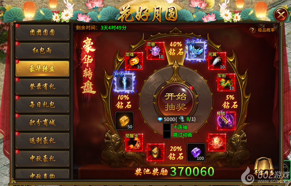 3) 豪华转盘(活动1-7天且开服天数达到36天开启,奖池跨服共享,初始有50万钻石,每参与一次抽奖增加500钻石,每次抽奖均有概率抽到不同比例的奖池钻石):